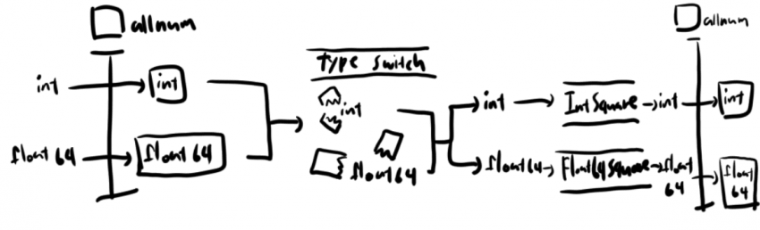 자신을 제곱한 결과를 반환하는 어떤 함수를 만들려고 하고, 이때 int와 float64 두 가지 타입을 인자로 받을 수 있도록 만들 계획이라고 한다.