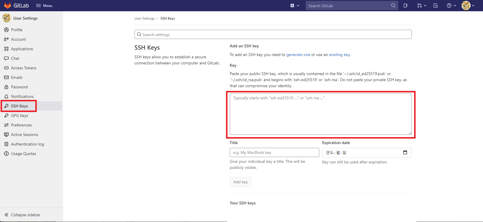 - GitLab 접속 → 우측 상단 프로필 → Edit profile 클릭 → 왼쪽 바에 SSH keys 클릭