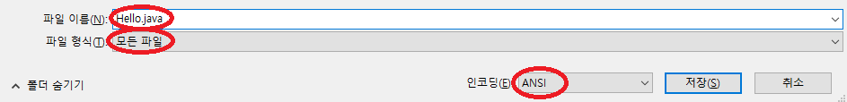 입력이 끝났으면 저장을 할때 파일의 확장자는 .java로 하고 파일형식은 모든파일 인코딩은 ANSI로 해준다.