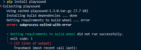 Python에서 mp3파일 재생을 위해 playsound 라이브러리를 설치하려고 하는데 다음과 같이 오류가 발생하였다.