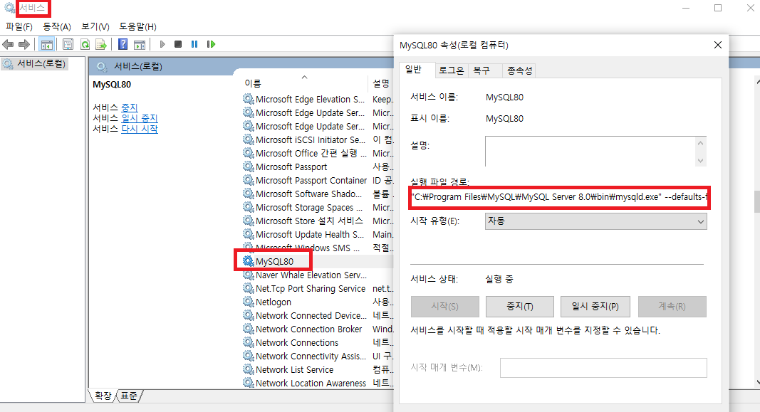 - 윈도우10: [찾기] -> [서비스] -> [MySQLxx] -> [실행 파일 경로]