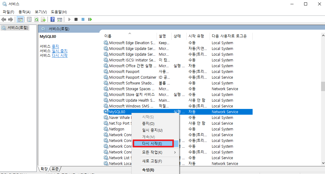 [서비스] -> [MySQL xx] -> [다시 시작(E)]